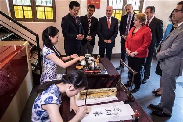 巴切萊特在孔子學(xué)院拉美中心觀看茶藝表演。