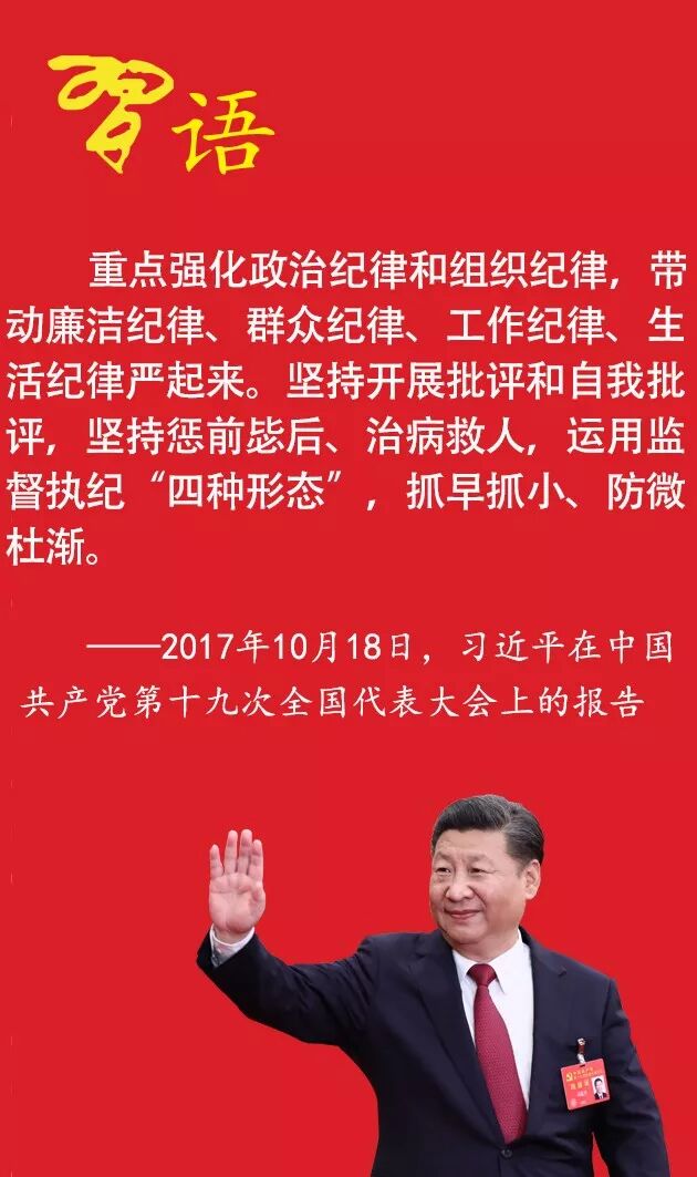 黨的十九大報告在闡述新時代黨的建設(shè)總要求時提出,“全面推進黨的政治建設(shè)、思想建設(shè)、組織建設(shè)、作風建設(shè)、紀律建設(shè),把制度建設(shè)貫穿其中,深入推進反腐敗斗爭。”紀律建設(shè)首次與政治建設(shè)、思想建設(shè)、組織建設(shè)、作風建設(shè)并列納入黨的建設(shè)中,凸顯了紀律建設(shè)的重要性。一起來學習習近平總書記關(guān)于紀律建設(shè)的重要論述吧。 加強紀律建設(shè)是全面從嚴治黨的治本之策,必須把紀律建設(shè)擺在更加突出位置 黨要管黨、從嚴治黨,紀律建設(shè)是治本之策。依規(guī)治黨,首先是把紀律和規(guī)矩立起來、嚴起來,執(zhí)行起來。黨的性質(zhì)、宗旨都決定了紀嚴于法、紀在法前。要把黨的紀律和規(guī)矩挺在前面,用紀律和規(guī)矩管住大多數(shù),使所有黨員干部嚴格執(zhí)行黨規(guī)黨紀、模范遵守法律法規(guī),做到黨內(nèi)監(jiān)督不留死角、沒有空白。 ——2015年6月11日,習近平在十八屆中央政治局常委會議審議巡視工作條例修訂稿時的講話 加強紀律建設(shè)是全面從嚴治黨的治本之策。我們黨是用革命理想和鐵的紀律組織起來的馬克思主義政黨,組織嚴密、紀律嚴明是黨的優(yōu)良傳統(tǒng)和政治優(yōu)勢,也是我們的力量所在。全面從嚴治黨,重在加強紀律建設(shè)。 ——2015年10月8日,習近平在十八屆中央政治局常委會第一百一十九次會議關(guān)于審議中國共產(chǎn)黨廉政準則、黨紀處分條例修訂稿時的講話 把紀律建設(shè)擺在更加突出位置。1859年,馬克思在致恩格斯的信中指出:“必須絕對保持黨的紀律,否則將一事無成?!睙o數(shù)案例證明,黨員“破法”,無不始于“破紀”。只有把紀律挺在前面,堅持紀嚴于法、紀在法前,才能克服“違紀只是小節(jié)、違法才去處理”的不正常狀況,用紀律管住全體黨員。 ——2016年1月12日,習近平在第十八屆中央紀律檢查委員會第六次全體會議上的講話 把紀律和規(guī)矩立起來、嚴起來、執(zhí)行到位 依規(guī)治黨必須有堅強的制度做保證,首先是把紀律和規(guī)矩立起來、嚴起來,執(zhí)行要到位。黨的性質(zhì)、宗旨都決定了紀嚴于法、紀在法前。要把執(zhí)法、執(zhí)紀貫通起來,把黨的紀律和規(guī)矩挺在前面,用黨的紀律、規(guī)矩管住大多數(shù),使所有黨員、干部嚴格執(zhí)行黨規(guī)黨紀、模范遵守法律法規(guī)。 ——2015年6月26日,習近平在十八屆中央政治局會議審議巡視工作條例修訂稿時的講話 反腐倡廉法規(guī)制度一經(jīng)建立,就要讓鐵規(guī)發(fā)力、讓禁令生威,確保各項法規(guī)制度落地生根。好的法規(guī)制度如果不落實,只是寫在紙上、貼在墻上、編在手冊里,就會成為“稻草人”、“紙老虎”,不僅不能產(chǎn)生應(yīng)有作用,反而會損害法規(guī)制度的公信力。 ——2015年6月26日,習近平在十八屆中央政治局第二十四次集體學習時的講話 把紀律挺在前面,著力解決人民群眾反映最強烈、對黨的執(zhí)政基礎(chǔ)威脅最大的突出問題。出臺中央八項規(guī)定,嚴厲整治形式主義、官僚主義、享樂主義和奢靡之風,堅決反對特權(quán)。 ——2017年10月18日,習近平在中國共產(chǎn)黨第十九次全國代表大會上的報告 重點強化政治紀律和組織紀律,帶動其他紀律嚴起來 要堅持問題導向,把嚴守政治紀律和政治規(guī)矩放在首位。加強黨的紀律建設(shè),要針對現(xiàn)階段黨紀存在的主要問題,更加強調(diào)政治紀律和政治規(guī)矩。這次修訂的條例將紀律整合為政治紀律、組織紀律、廉潔紀律、群眾紀律、工作紀律和生活紀律,其中政治紀律是打頭、管總的。實際上你違反哪方面的紀律,最終都會侵蝕黨的執(zhí)政基礎(chǔ),說到底都是破壞黨的政治紀律。因此,講政治、遵守政治紀律和政治規(guī)矩永遠排在首要位置。要抓住這個綱,把嚴肅其他紀律帶起來。 ——2015年10月8日,習近平在十八屆中央政治局常委會第一百一十九次會議關(guān)于審議中國共產(chǎn)黨廉政準則、黨紀處分條例修訂稿時的講話 重點強化政治紀律和組織紀律,帶動廉潔紀律、群眾紀律、工作紀律、生活紀律嚴起來。堅持開展批評和自我批評,堅持懲前毖后、治病救人,運用監(jiān)督執(zhí)紀“四種形態(tài)”,抓早抓小、防微杜漸。 ——2017年10月18日,習近平在中國共產(chǎn)黨第十九次全國代表大會上的報告 各級黨組織和全體黨員、各級領(lǐng)導干部必須堅決維護黨中央權(quán)威,堅決服從黨中央集中統(tǒng)一領(lǐng)導,把“四個意識”落實在崗位上、落實在行動上,不折不扣執(zhí)行黨中央決策部署,始終在思想上政治上行動上同黨中央保持高度一致。 ——2017年10月19日,習近平在參加黨的十九大貴州省代表團討論時強調(diào) 各級領(lǐng)導干部特別是高級干部要在守紀律、講規(guī)矩上作表率 高級干部特別是中央領(lǐng)導層組成人員必須以身作則,模范遵守黨章黨規(guī),嚴守黨的政治紀律和政治規(guī)矩,堅持不忘初心、繼續(xù)前進,堅持率先垂范、以上率下,為全黨全社會作出示范。 ——2016年10月24日,習近平《關(guān)于〈關(guān)于新形勢下黨內(nèi)政治生活的若干準則〉和〈中國共產(chǎn)黨黨內(nèi)監(jiān)督條例〉的說明》 高級干部要清醒認識自己崗位的特
