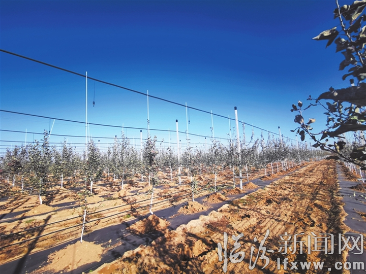 臨汾新聞網(wǎng)訊 一排排水泥立桿密集而整齊地矗立,立桿之間的四道銀色鐵絲在空中劃出筆直的線,穩(wěn)固支撐著幼樹,株距僅1.5米、行距4米的果樹行列整齊,拇指粗細的蘋果樹苗透著勃勃生機……隆冬時節(jié),古縣南垣鄉(xiāng)東池村的現(xiàn)代蘋果產(chǎn)業(yè)示范基地里,呈現(xiàn)出一幅生機勃勃的圖景。