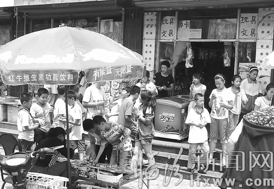 學(xué)校周邊的小賣部外,孩子們爭(zhēng)相購買三無食品。記者 蘇亞兵 攝