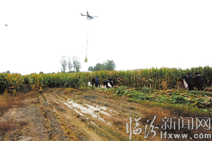 上圖:10月16日,在山西好的糧農(nóng)業(yè)科技有限公司玉米產(chǎn)業(yè)園內(nèi),來自共青團(tuán)堯都區(qū)委的志愿者正在無人機(jī)的協(xié)作下?lián)屖沼衩住?/p>