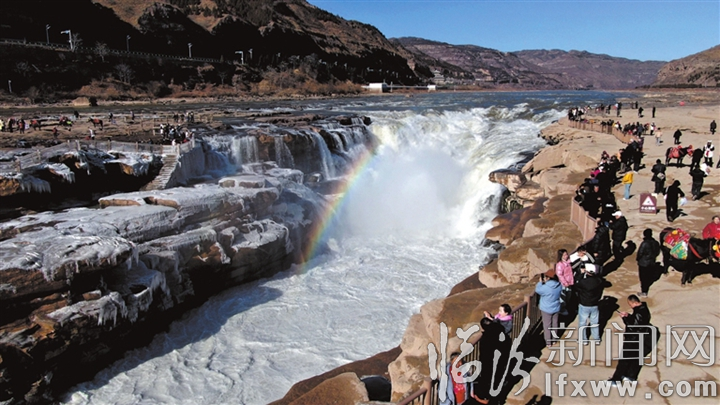 臨汾新聞網(wǎng)訊 12月25日,游客在吉縣黃河壺口瀑布游覽觀瀑(無人機(jī)照片)。近日,受持續(xù)降溫天氣影響,黃河壺口瀑布出現(xiàn)冰掛景觀,層層疊疊的冰掛與瀑布上空飛架的彩虹交相輝映,美不勝收。