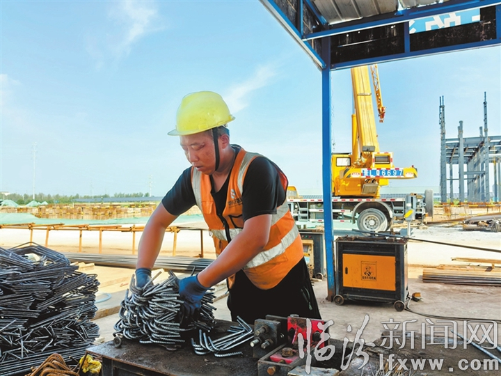 小小的鋼筋加工棚內(nèi),工人們分工明確、配合嫻熟,有的在分割鋼筋,有的清點鋼筋,有的在測量尺寸……
