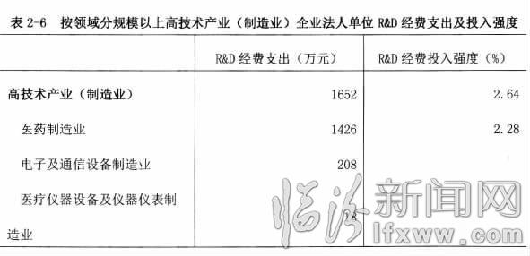 2013年,規(guī)模以上高技術(shù)產(chǎn)業(yè)(制造業(yè))企業(yè)法人單位R&D經(jīng)費支出1652萬元,占規(guī)模以上制造業(yè)的比重為3.65%(詳見表2-6)。