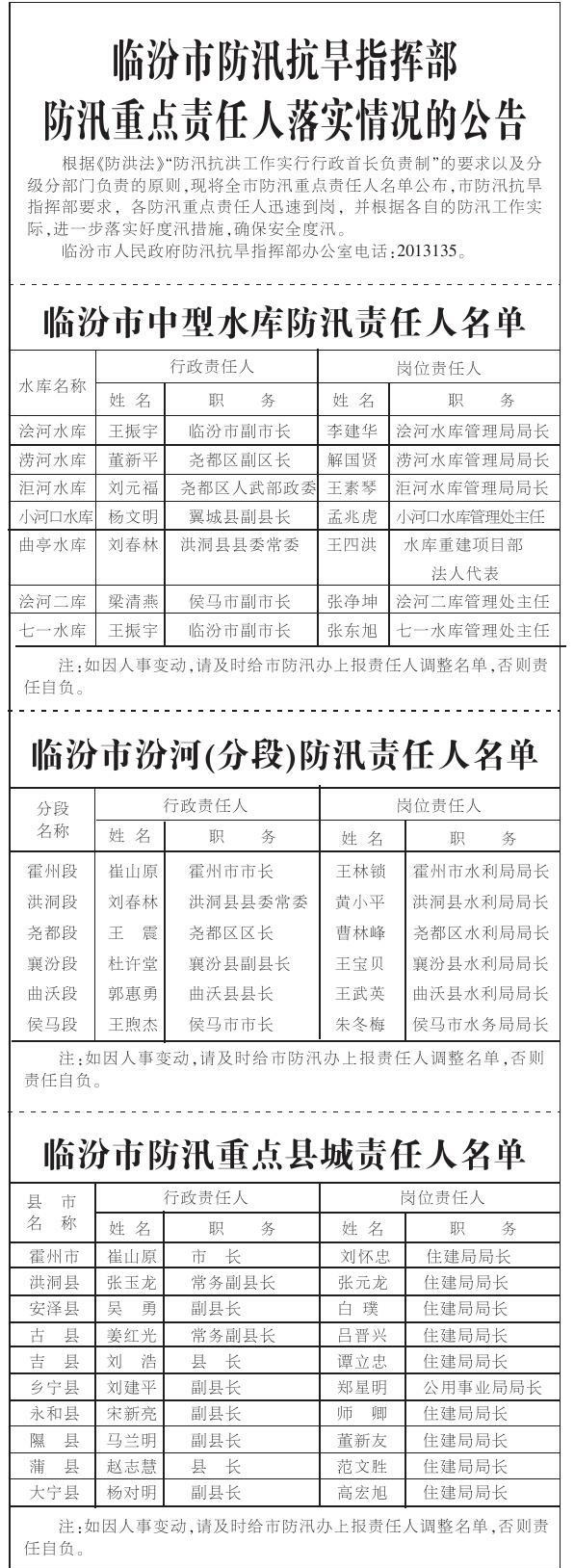 根據(jù)《防洪法》“防汛抗洪工作實(shí)行行政首長(zhǎng)負(fù)責(zé)制”的要求以及分級(jí)分部門負(fù)責(zé)的原則,現(xiàn)將全市防汛重點(diǎn)責(zé)任人名單公布,市防汛抗旱指揮部要求,各防汛重點(diǎn)責(zé)任人迅速到崗,并根據(jù)各自的防汛工作實(shí)際,進(jìn)一步落實(shí)好度汛措施,確保安全度汛。
