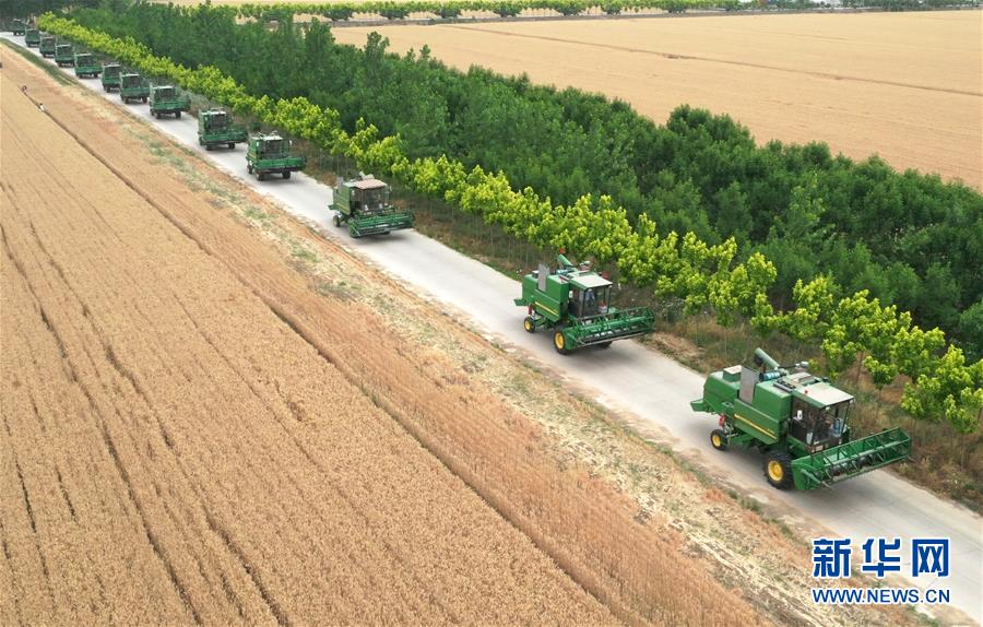 在河南省黃泛區(qū)農(nóng)場九分場,農(nóng)機(jī)隊(duì)伍準(zhǔn)備進(jìn)入麥田作業(yè)(6月2日攝,無人機(jī)照片)。新華社記者 李嘉南 攝