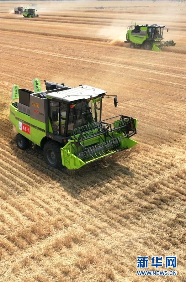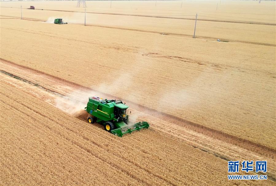 在河南省黃泛區(qū)農(nóng)場九分場,收割機(jī)在麥田中作業(yè)(6月2日攝,無人機(jī)照片)。新華社記者 李嘉南 攝