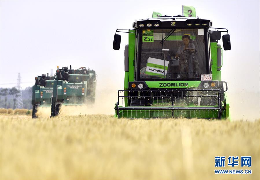 收割機(jī)在河南省西平縣二郎鎮(zhèn)張堯村的麥田中作業(yè)(5月26日攝)。新華社記者 李嘉南 攝