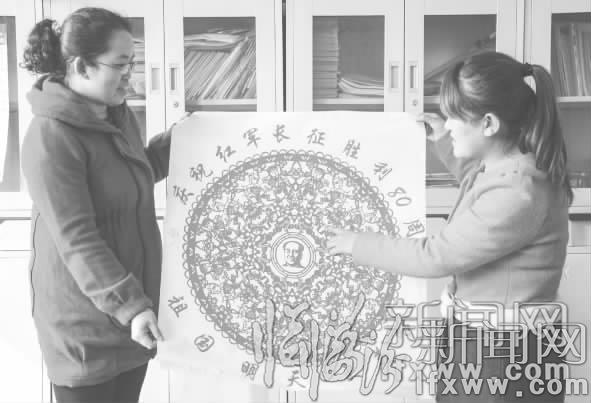 臨汾新聞網(wǎng)訊 11月4日,洪洞縣新英學(xué)校的老師段端端完成了剪紙作品《緬懷先烈,走好新的長征路》,紀(jì)念紅軍長征勝利80周年。 記者 張?zhí)N強(qiáng) 攝