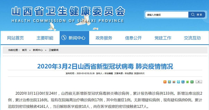 2020年3月1日0時至24時,山西省無新增新型冠狀病毒肺炎確診病例,累計報告確診病例133例。新增治愈出院2例,累計治愈出院116例?,F(xiàn)有在院隔離治療確診病例17例,其中危重癥1例。無新增疑似病例,現(xiàn)有疑似病例0例。累計追蹤到密切接觸者4161人,當(dāng)日解除醫(yī)學(xué)觀察10人,尚在醫(yī)學(xué)觀察的密切接觸者127人。
