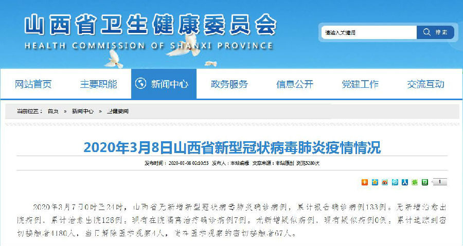 2020年3月7日0時至24時,山西省無新增新型冠狀病毒肺炎確診病例,累計報告確診病例133例。無新增治愈出院病例,累計治愈出院126例?,F(xiàn)有在院隔離治療確診病例7例。無新增疑似病例,現(xiàn)有疑似病例0例。累計追蹤到密切接觸者4180人,當(dāng)日解除醫(yī)學(xué)觀察4人,尚在醫(yī)學(xué)觀察的密切接觸者67人。