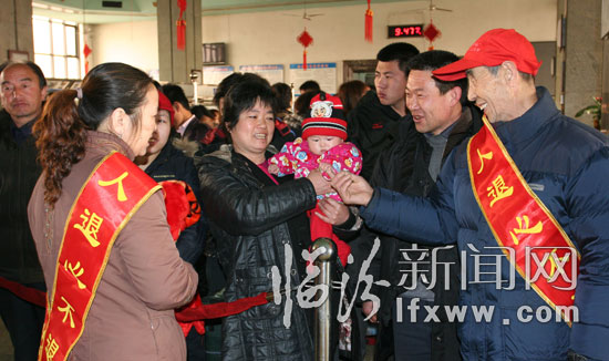 3月1日,在我市火車站,老年服務(wù)隊(duì)為出行的旅客服務(wù)。