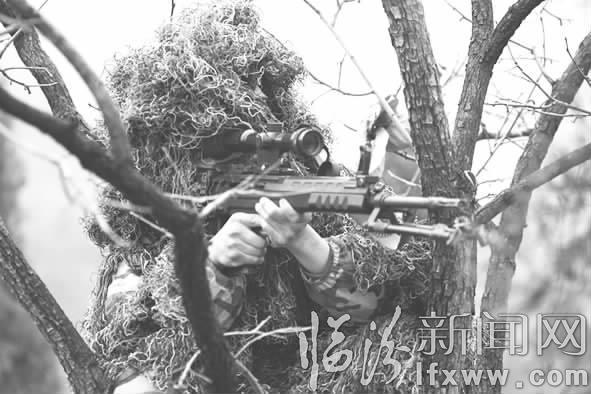 狙擊手身著偽裝服隱蔽在樹(shù)干上