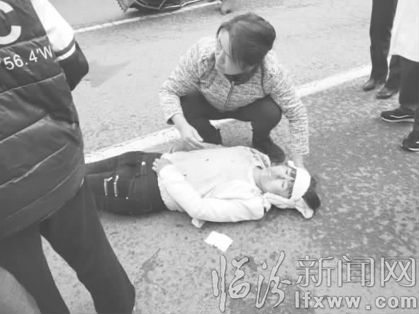 當(dāng)天上午,記者途經(jīng)市區(qū)解放西路時(shí),在錦鴻國(guó)際門口遇到一起車禍,一輛正欲駛上馬路的黑色大眾轎車撞倒一輛自西向東行駛的電動(dòng)摩托車,騎車的婦女被撞得仰面躺地,頭上流了不少血。車禍發(fā)生后,黑色小車立即停車,路人則圍攏上來,有的查看婦女傷勢(shì),問她哪里不舒服;有的則安撫她車上帶著與她一同摔倒的孩子,幸好孩子看上去無恙;有的則立即報(bào)警或撥打120;馬路對(duì)面世康體檢中心的醫(yī)護(hù)人員聞?dòng)嵹s來,安撫她不要緊張,并囑路人,傷情不明,最好不要搬動(dòng)傷者。此時(shí),一位路人提供了一條毛巾,折疊起來先護(hù)住了傷者的頭部。