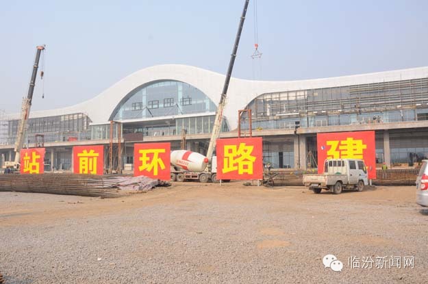 臨汾西站為大西客運(yùn)專線晉南段規(guī)模最大的一座地級(jí)市高鐵站,車站最高聚集人數(shù)1000人,高峰小時(shí)發(fā)送量2000人/小時(shí)。位于市區(qū)西側(cè)劉村鎮(zhèn),車站橫穿周家莊和樊家莊,距離市區(qū)約3.5公里。站房配套工程總投資15.7億元(含征地拆遷3.7億元),主要包括景觀大道、站前廣場(chǎng)及環(huán)路、站前高架立交平臺(tái)等8項(xiàng)工程。其中:景觀大道全長(zhǎng)2097米,站前廣場(chǎng)11.6萬(wàn)平方米,環(huán)路4條1296米;站前高架立交平臺(tái)兩層,四個(gè)(兩上兩下)立交匝道,建設(shè)面積1.63萬(wàn)平方米。此外,還包括城市公交樞紐站、公路客運(yùn)站、出租車候客停車場(chǎng)和社會(huì)停車場(chǎng)。