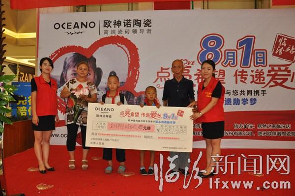臨汾新聞網(wǎng)訊 8月1日下午,歐神諾臨汾營銷服務(wù)中心總經(jīng)理逯學(xué)斌,將14312善款元親遞交給共青團(tuán)臨汾市委臨汾市青年志愿者協(xié)會秘書長梁李平手中,指定專項(xiàng)用于資助吉鵬程和段文豪的在校學(xué)習(xí)與生活。至此,為期28天的“點(diǎn)燃希望?傳遞愛心”助學(xué)活動(dòng)(臨汾站)已告段落,下一站(孝義站)隨即啟動(dòng)。