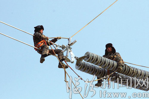 “今天,我們主要進(jìn)行的是導(dǎo)線壓接的工作,你看,現(xiàn)在工人們正在近40米高的鐵塔上進(jìn)行導(dǎo)線安裝作業(yè),這可容不得一絲一毫地大意啊!”順著臨汾送變電工程公司副經(jīng)理陳斌手指的方向,記者抬頭仰望,在40米的高空鐵塔上,只見兩位“蜘蛛俠”正在有條不紊地完成自己的“差事”。