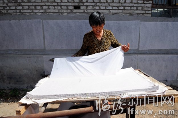 襄汾縣鄧莊鎮(zhèn)西侯村帝堯麻箋廠的一位女工在曬紙。