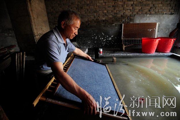 在襄汾縣鄧莊鎮(zhèn)西侯村帝堯麻箋廠,有30年造紙經(jīng)驗(yàn)的鄧僧安老人在撈紙。