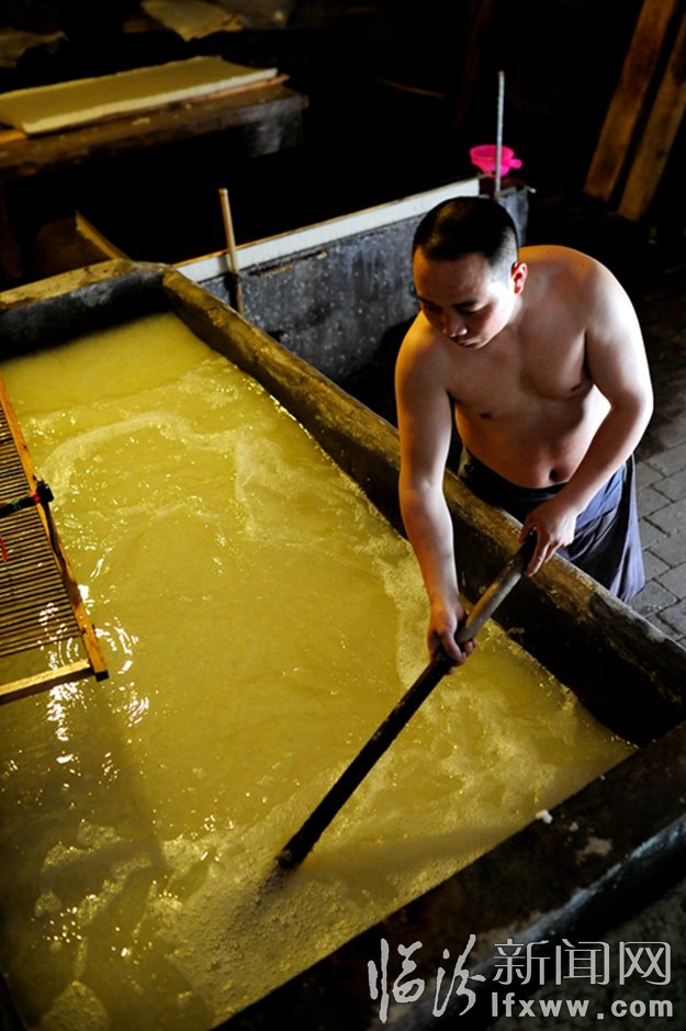 襄汾縣帝堯麻箋廠的工人正在撈紙。