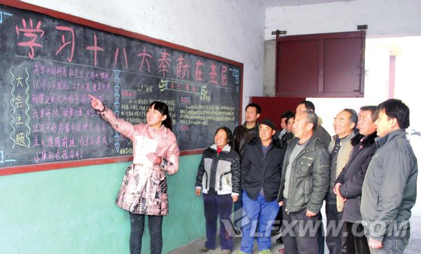 近日,襄汾縣古城鎮(zhèn)大學(xué)生村干部、北侯村黨支部書記崔麗晶在向村民宣傳黨的十八大精神。該鎮(zhèn)成立了大學(xué)生“村官”宣講團,深入各村組織黨員學(xué)習(xí),并以撰寫黑板報、懸掛橫幅、廣播播講等形式宣傳黨的十八大精神。
