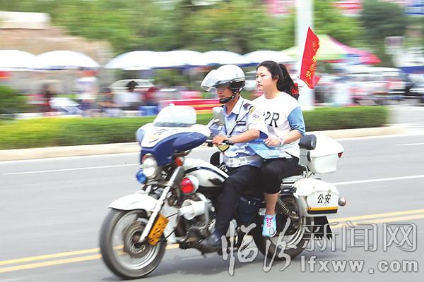 6月7日,在去往新一中的路上,一交警護(hù)送考生去考場。