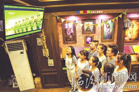 體育南街巴拉嘟嘟影樓的員工擠在一起觀看閱兵式。