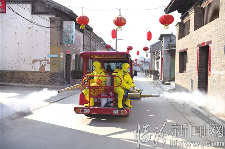 圖② 2月4日,襄汾縣藍(lán)天救援隊(duì)隊(duì)員深入該縣新城鎮(zhèn)丁村開展義務(wù)消毒作業(yè)。
