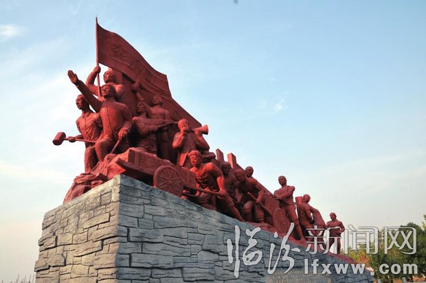 11月15日,一座長15米、高10米、寬4米的大型雕塑在曲沃縣澮河北岸落成。上世紀50年代,5萬晉南兒女依靠雙手,攻堅克難,戰(zhàn)天斗地,建成庫容1億立方米,干渠150余公里的澮河水庫。這組以“澮河魂”命名的雕塑群,用19位挑擔(dān)、送水、打夯、拉飛車的典型人物再現(xiàn)了當時壯觀的勞動場景。劉紅兵 攝