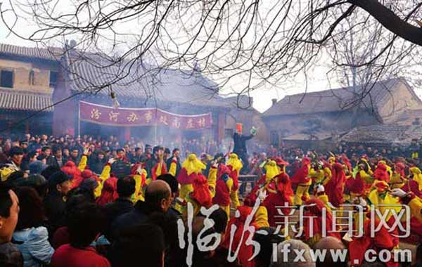 每年農(nóng)歷正月廿六,趁著春節(jié)的喜慶氛圍還未散去,堯都區(qū)洪北溝龍泉寺娘娘廟舉行盛大的廟會(huì)。2月25日,甲午年廟會(huì)再次如期舉行,墻上貼著喜慶的戲報(bào),鏗鏘的鑼鼓之聲不絕于耳。在仿古祭祀儀式后,大型文藝表演,諸如威風(fēng)鑼鼓、腰鼓、秧歌、健美操、太極拳等群眾性文化娛樂(lè)活動(dòng)輪番上陣,同時(shí)還有商貿(mào)、農(nóng)副產(chǎn)品展銷等活動(dòng)如火如荼舉行。