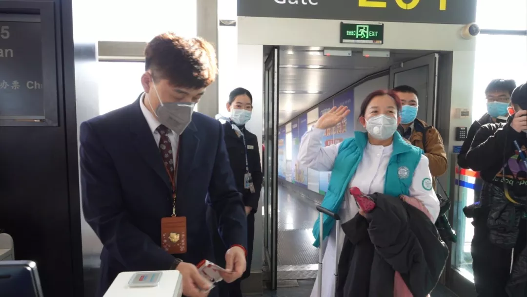 14時(shí)58分 太原武宿國(guó)際機(jī)場(chǎng)登機(jī)口候機(jī)窗外,天空蔚藍(lán),午后的冬日暖陽(yáng)直直地照進(jìn)大廳,照在弓清梅和隊(duì)員們的臉上。這樣的風(fēng)景,弓清梅和隊(duì)員們無(wú)暇欣賞,他們就要登上飛機(jī),正式啟程。等待他們的,是疫情最前線——他們將奔赴武漢,進(jìn)入華中科技大學(xué)同濟(jì)醫(yī)學(xué)院附屬同濟(jì)醫(yī)院等疫情最嚴(yán)重的地方,展開(kāi)救治。