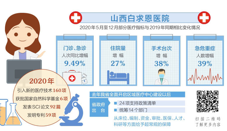 一張圖表上,列舉了山西白求恩醫(yī)院2020年5月至12月的7項(xiàng)醫(yī)療指標(biāo)與2019年同期相比的變化情況。“門、急診的人次同比增幅達(dá)9.49%,住院量增幅達(dá)27%,手術(shù)臺(tái)次增幅達(dá)38%,其中四級(jí)手術(shù)的臺(tái)數(shù)增加超過70%,急危重癥人數(shù)增幅達(dá)39%,引入新的醫(yī)療技術(shù)160項(xiàng)……”,山西白求恩醫(yī)院同濟(jì)山西醫(yī)院副院長劉先勝指著幾項(xiàng)增長幅度靠前的指標(biāo)詳細(xì)介紹。