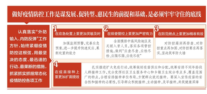 林武在講話中指出,做好疫情防控工作是謀發(fā)展、促轉(zhuǎn)型、惠民生的前提和基礎(chǔ),是必須牢牢守住的底線。要深入貫徹黨中央及省委決策部署,認真落實“外防輸入、內(nèi)防反彈”工作方針,始終緊繃疫情防控這根弦,用最堅決的態(tài)度、最迅速的行動、最果斷的措施,抓緊抓實抓細常態(tài)化疫情防控各項工作。一是在應(yīng)急處置上要更加靈敏及時。加強監(jiān)測預(yù)警,完善應(yīng)急預(yù)案,進一步提升快速反應(yīng)、果斷處置的能力。立足更精準更有效地防,做好發(fā)熱門診信息登記和預(yù)檢篩查,精準開展防控研判,做到早發(fā)現(xiàn)、早報告。深入開展疫情防控培訓(xùn)和應(yīng)急指揮、聯(lián)合處置演練,做好應(yīng)對突發(fā)情況的各項工作準備,強化督促指導(dǎo),確保第一時間反應(yīng),第一時間決策,第一時間處置,牢牢掌握防控主動權(quán)。二是在排查管控上要更加嚴密有力。全面摸排中高風險地區(qū)及關(guān)聯(lián)入晉人員,落實各項管控措施,做到“應(yīng)查盡查、應(yīng)檢盡檢、應(yīng)隔盡隔、應(yīng)收盡收”。強化屬地“第一落點”管控責任,關(guān)口前移,管控前置,實施有效的動態(tài)排查,織密織牢管控體系。三是在防范燃點上要更加精準有效。對防控漏洞再排查、對防控重點再加固、對防控要求再落實,堅決筑牢防火墻。要周密做好國際航班經(jīng)停太原入境防控、進口冷鏈物流管理、醫(yī)療機構(gòu)院感防控、隔離酒店管理等工作,確保各項工作措施環(huán)環(huán)緊扣、精準有效、不出紕漏。要以更嚴格的管理強化校園安全防控,繼續(xù)做好景區(qū)、餐飲、文化娛樂等人員流動性大的場所,養(yǎng)老、救助、兒童福利機構(gòu)等重點部位的疫情防控工作,嚴防輸入性、聚集性、關(guān)聯(lián)性感染風險。要對入境人員加強管理,設(shè)置專用通道,縮短登記轉(zhuǎn)運時間,減少人員聚集交叉感染風險。對醫(yī)務(wù)人員、隔離場所、交通場站一線工作人員等,要持續(xù)強化個人防控、健康監(jiān)測、閉環(huán)管理等措施。四是在疫苗接種上要更加擴面提效。扎實推進擴大免疫行動,統(tǒng)籌做好疫苗供應(yīng)和分配,統(tǒng)籌安排不同年齡段人群接種工作,充分發(fā)揮社區(qū)衛(wèi)生服務(wù)中心和鄉(xiāng)鎮(zhèn)衛(wèi)生院分布點多、覆蓋范圍廣的特點,合理安排接種單位布局,方便群眾就近接種。要深入宣傳疫苗的安全性和接種的必要性,引導(dǎo)群眾積極接種、主動接種、及早接種,共筑健康屏障。