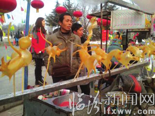一年一度的堯廟廟會吸引了眾多商家和游客,熙熙攘攘的人流中,五花八門的現(xiàn)代玩具讓人目不暇接,傳統(tǒng)的吹糖人藝人卻難以尋覓。2月10日,經(jīng)過多次尋找,在廟會的一角記者見到了一位河南來的吹糖人藝人孟令飛,他講述了吹糖人民俗藝術(shù)的傳承和現(xiàn)狀。